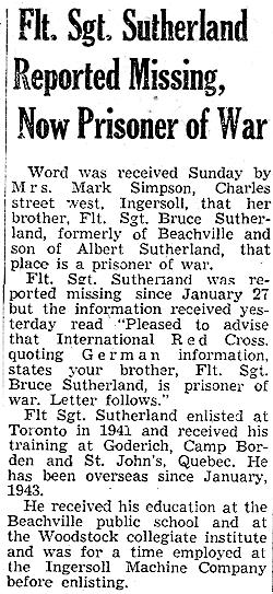Bruce SutherlandWhen the bomber was hit the first time on Bruce's inaugural mission, he was not sure if the plane was upside down, or falling, because he ended up suspended from the ceiling for a while. Once he fell back to the floor, the skipper told them to put their parachutes on. Bruce reached down and got his parachute and clipped it on to his harness. The wireless operator sitting near him could not find his parachute. He was frantically looking as the plane struggled in the air. Bruce was worried, and as he looked for the other parachute, originally placed next to his, the second hit blew the front turret off the aircraft where the gunner was... |
