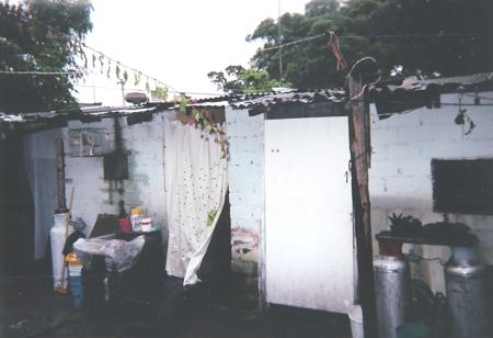 Many families live in these tin houses built side-by-side in a long row. These homes are roughly 15' by 15'.