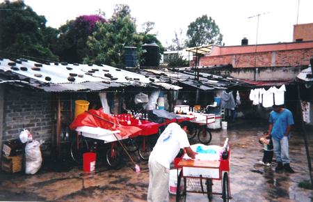 Many families live in these tin houses built side-by-side in a long row. These homes are roughly 15' by 15'.